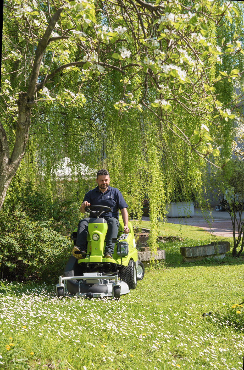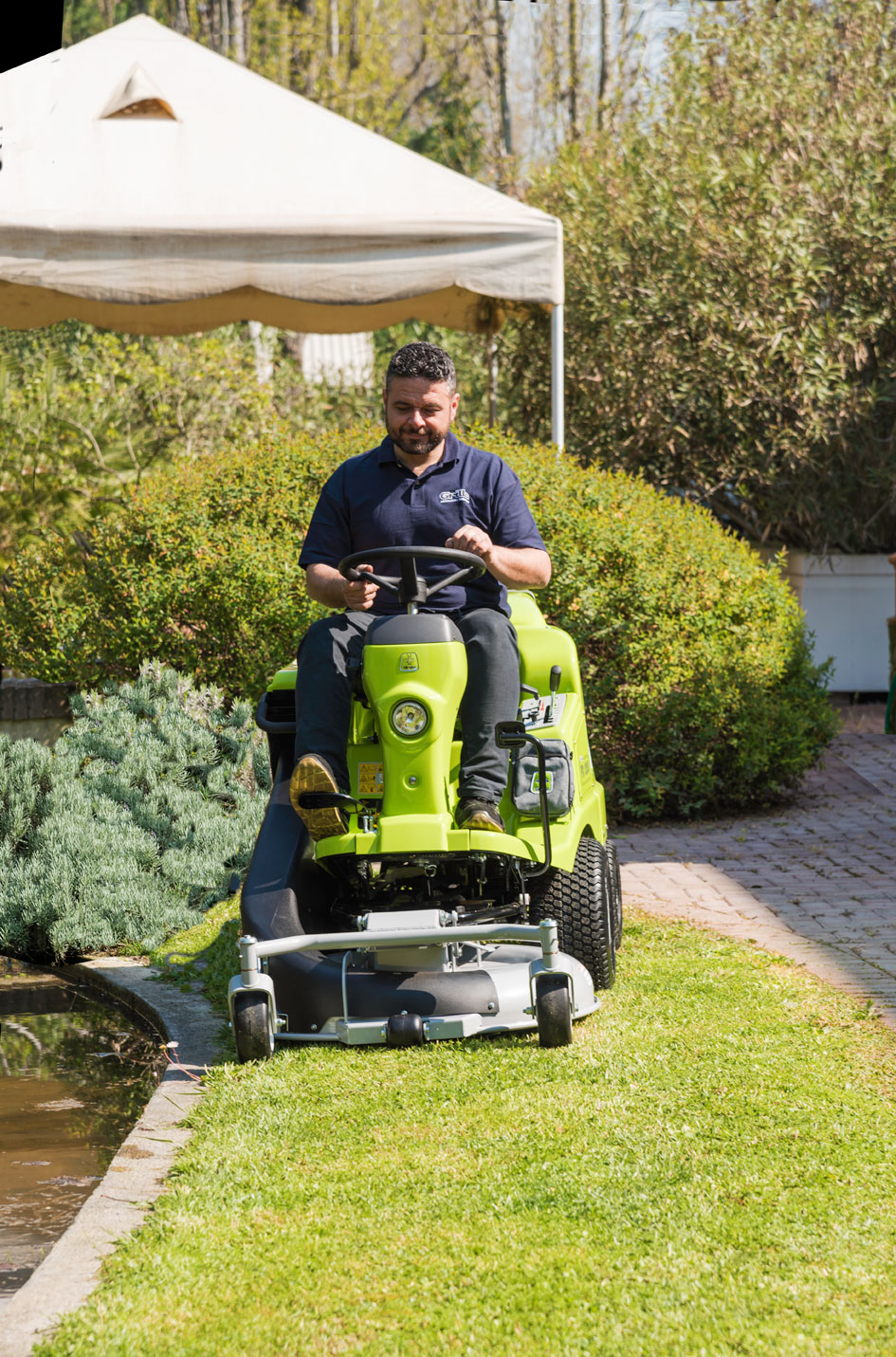 The floating cutting deck ensures a perfect cut even on undulating grounds. The rear swinging axle, the tyres with antiskid profile, allow, together with the pressure adjustment of the cutting deck on the ground, to follow with extreme precision any bumps and fold, and therefore eliminate the possibility of scalping the grass.