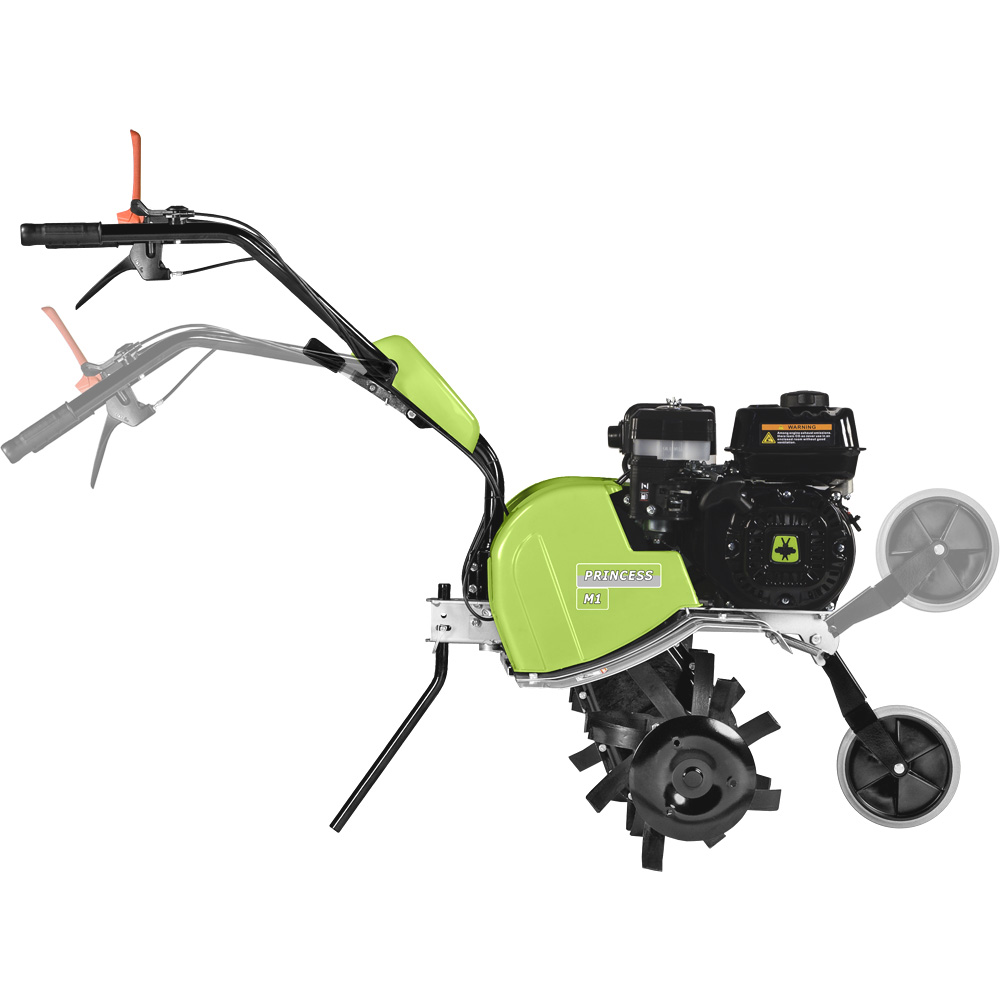 The height-adjustable spur can be fixed or oscillating and makes work easy while keeping the machine balanced. In addition, in the oscillating position it acts as a rudder for working around plants.
