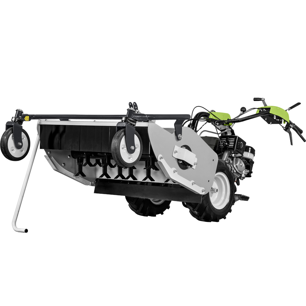 Le attrezzature disponibili sono spazzola orientabile e inclinabile da 100 cm, barra falciante PRO bilama da 132 cm, spazzola diserbatrice da 60 cm, lama orientabile 100 cm e spazzaneve da 70 cm.