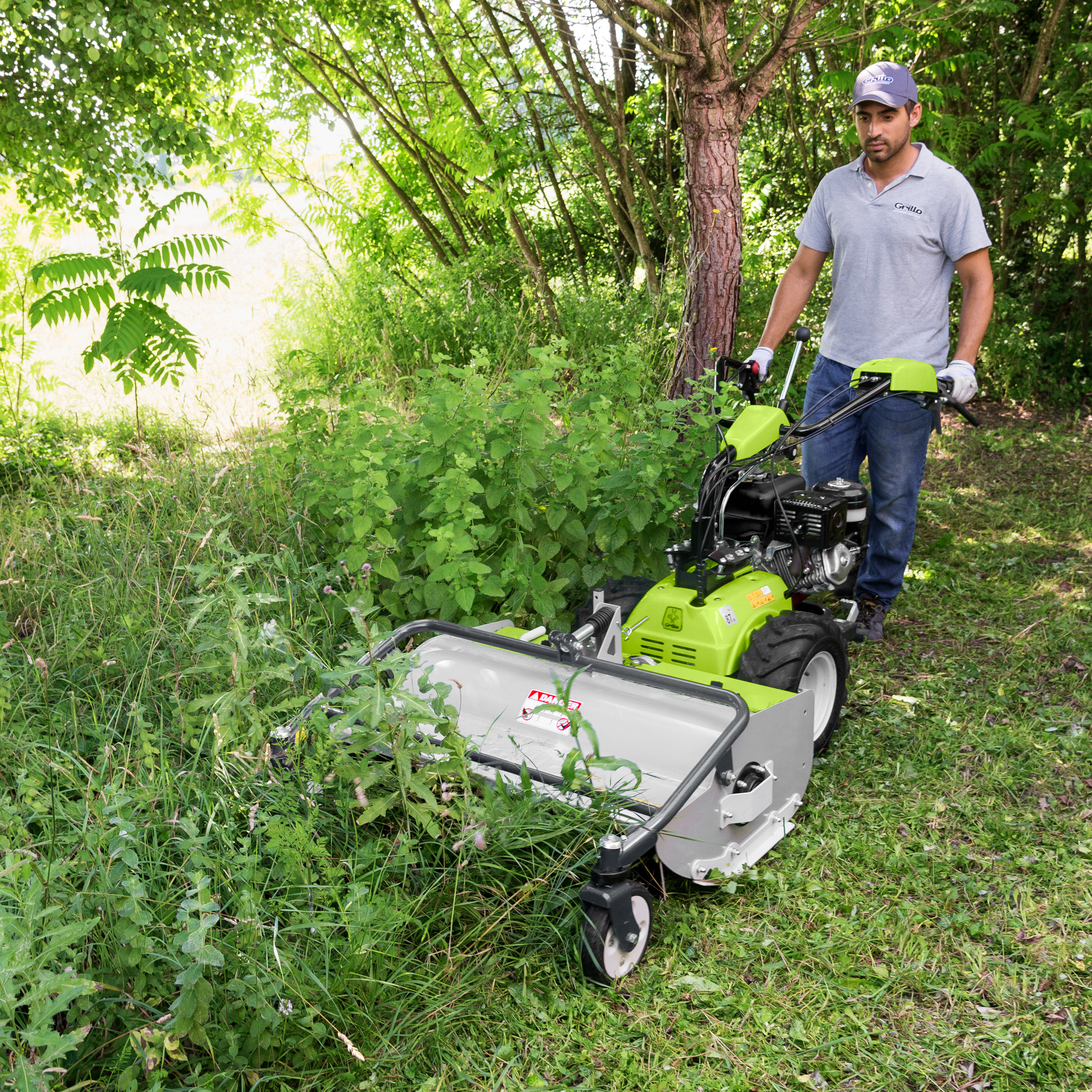 Grillo GH 9 può essere equipaggiato con due trinciatutto, da 68 e 85 cm di larghezza di lavoro. Sono dotati di un rotore con rispettivamente 16 e 20 coppie di coltelli ad “Y” in grado di macinare foglie, rami di potatura, residui vegetali, ed eliminare vegetali a fine coltura.